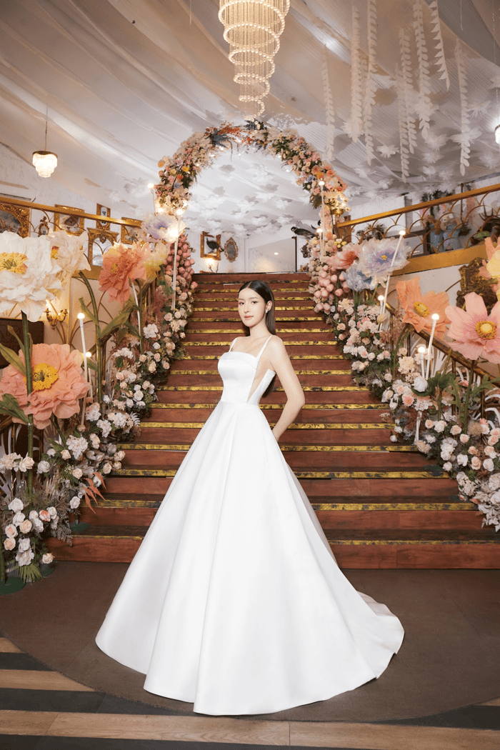 - Minimalist Glam (เรียบแต่โก้): ชุดราตรีสีขาวสะอาดตา ตัดเย็บด้วยผ้าซาตินเนื้อพรีเมียม เน้นโครงสร้างชุด (Structure) ที่เป๊ะ ช่วยเสริมบุคลิกให้ดูแพงโดยไม่ต้องมีงานปักเยอะ
