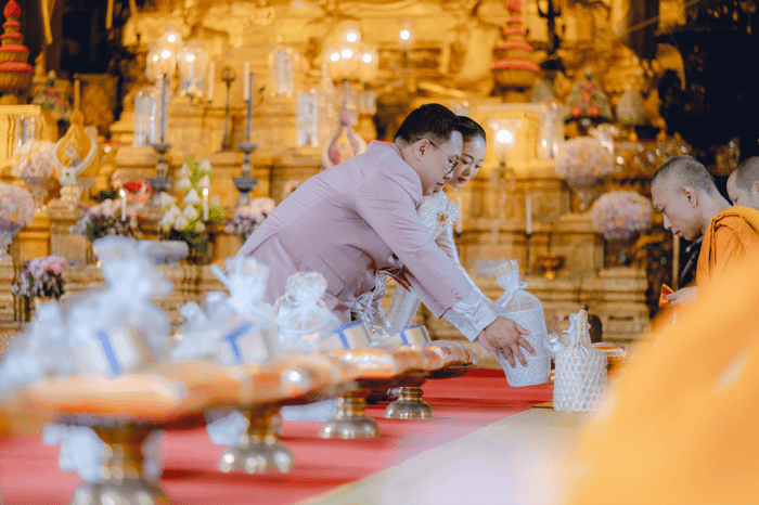 - การทำบุญตักบาตร: อีกหนึ่งภาพจำที่สวยงามใน Buddhist Prewedding คือการที่บ่าวสาวร่วมจับทัพพีตักบาตร ซึ่งสื่อถึงการครองคู่และทำบุญร่วมชาติ